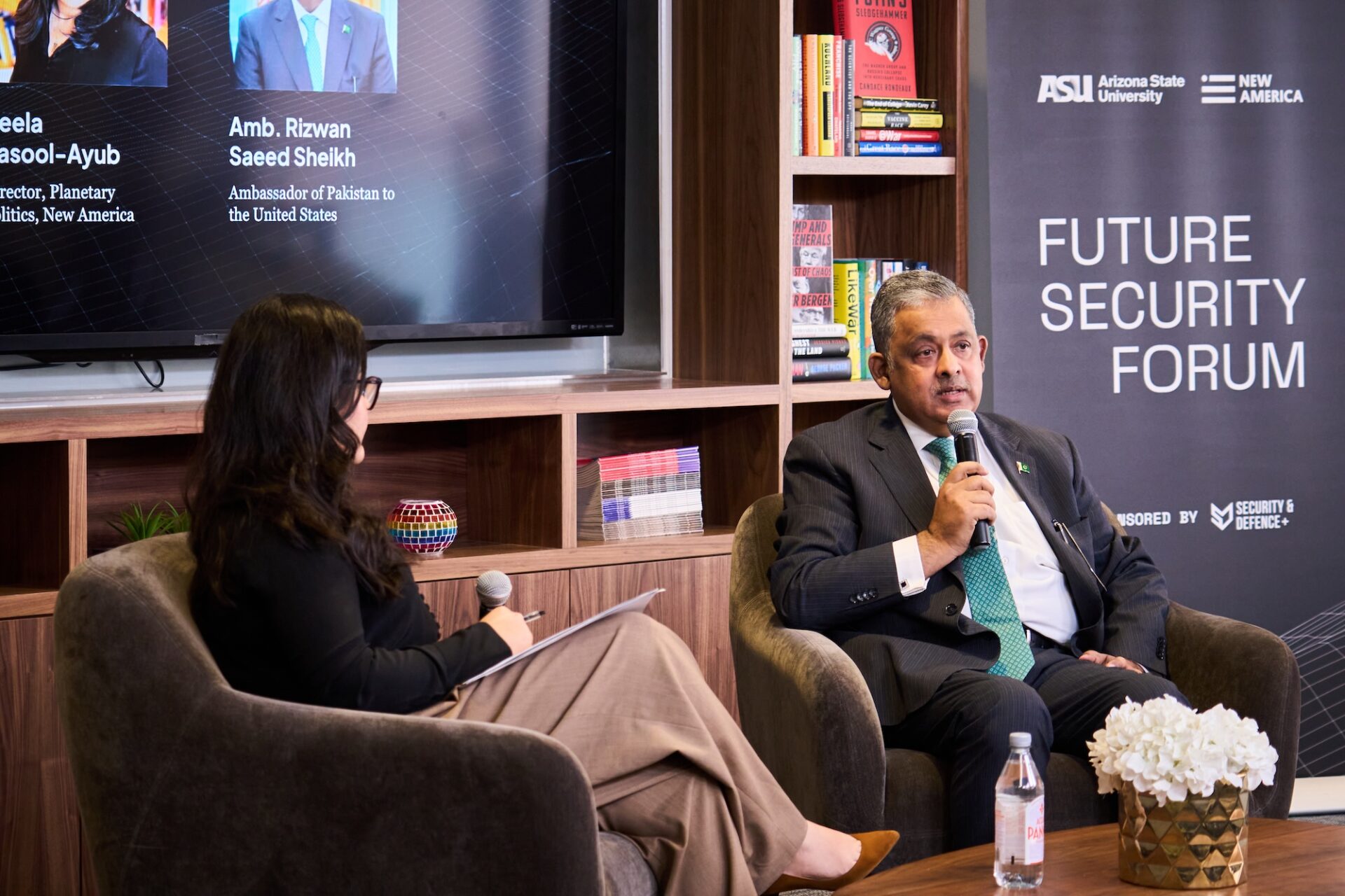In a conversation with New America’s Heela Rasool-Ayub, Pakistani Ambassador Rizwan Saeed Sheikh emphasised that Pakistan’s diplomacy today is deeply intertwined with climate policy and economic security. Referencing the country’s devastating floods, he remarked: “climate is not an abstract for Pakistan,” but “real, clear and present danger”.